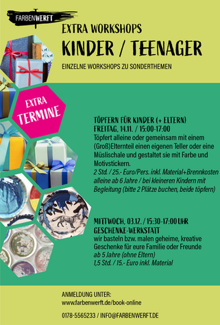 Ein fester Bestandteil der Farbenwerft sind auch regelmäßige Töpferkurse für alle Altersstufen. Hier könnt ihr eigenes Geschirr oder Dekoobjekte formen und farbig gestalten.
